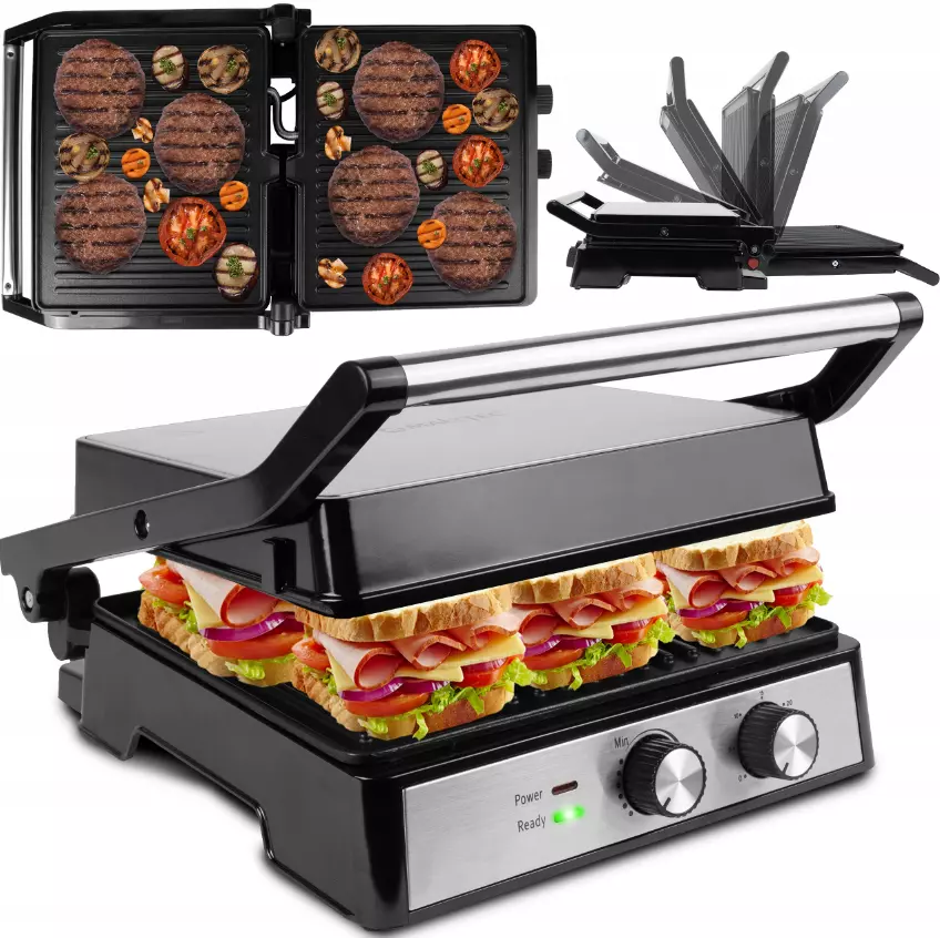 До 3 положений гриля: настольный гриль (открытый) 180°, тостер (закрытый), контактный гриль (полуоткрытый) 90°.