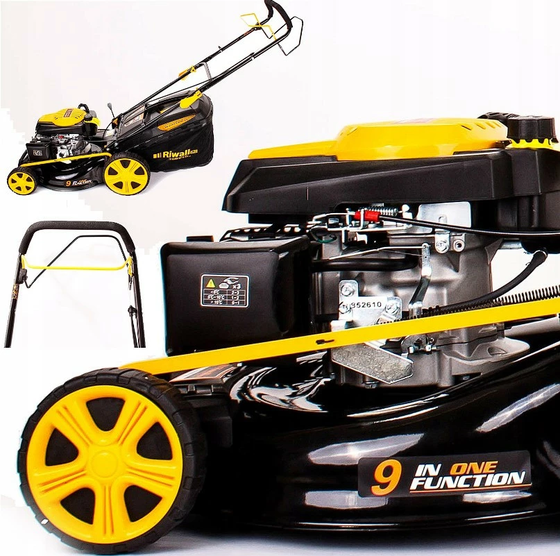 Газонокосилка бензиновая чешского бренда с приводом RIWALL 5190 9in1 ECO с новым обновленным внешним видом и дополнительным специальным бампером, изготовленным из очень твердого и прочного АБС-пластика.