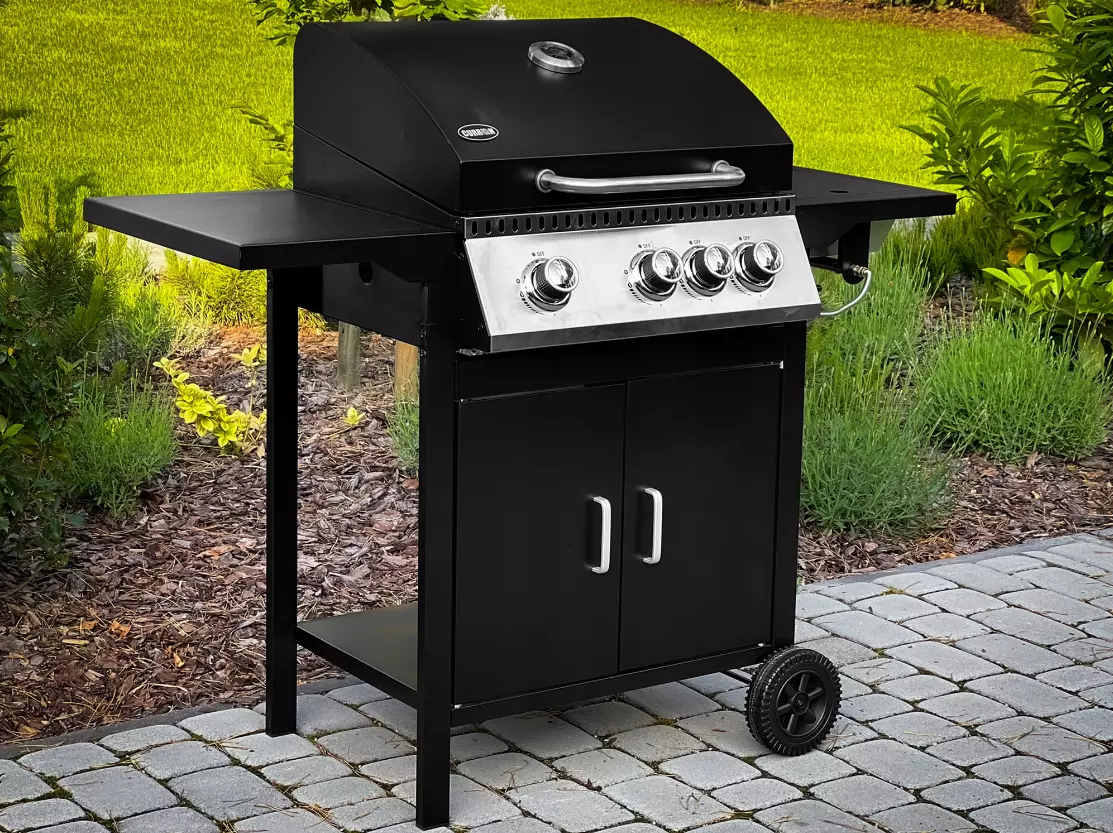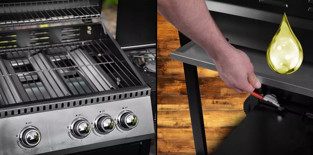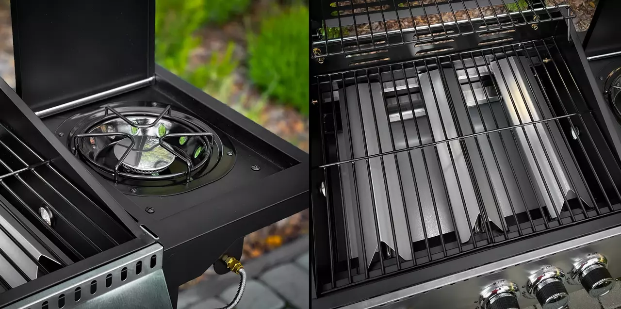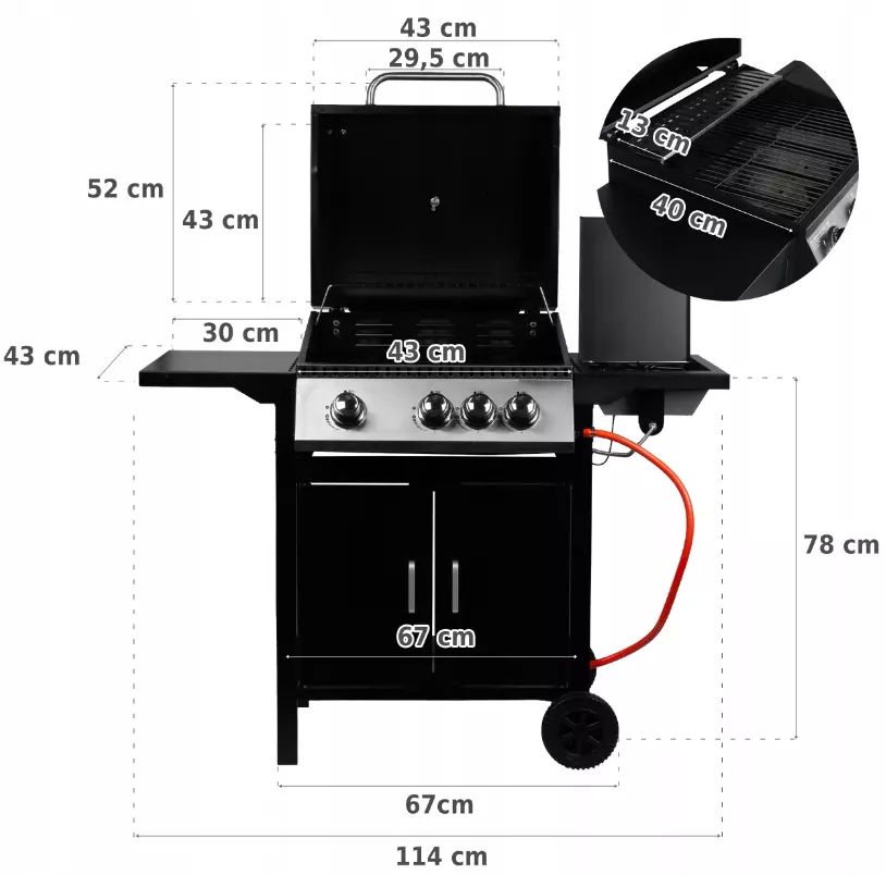 ◾ 4 МОЩНЫЕ ГОРЕЛКИ ◾ БОЛЬШАЯ ХРОМИРОВАННАЯ РЕШЕТКА ◾ БЕЗДЫМНАЯ ◾ ШКАФ ДЛЯ АКСЕССУАРОВ ◾ ДОПОЛНИТЕЛЬНАЯ ПОЛКА ◾ КОЛЕСА ◾ ТЕРМОМЕТР ◾