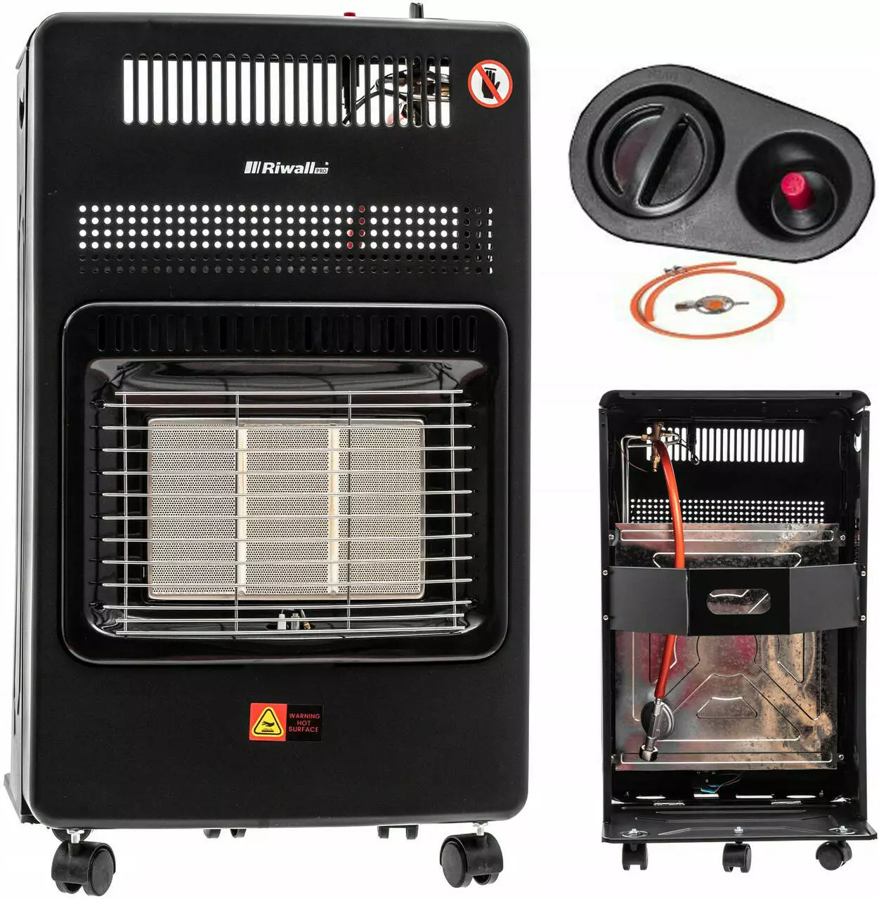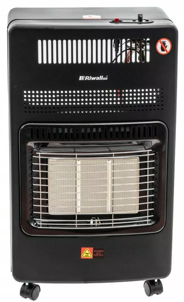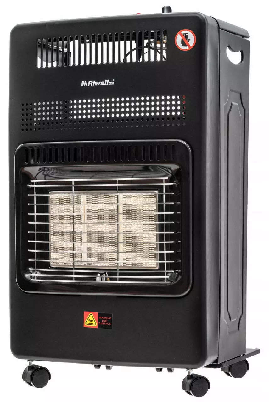 В газовом обогревателе Riwall 4200W газ сжигается на керамических пластинах, которые дополнительно нагреваются для излучения дополнительного тепла.