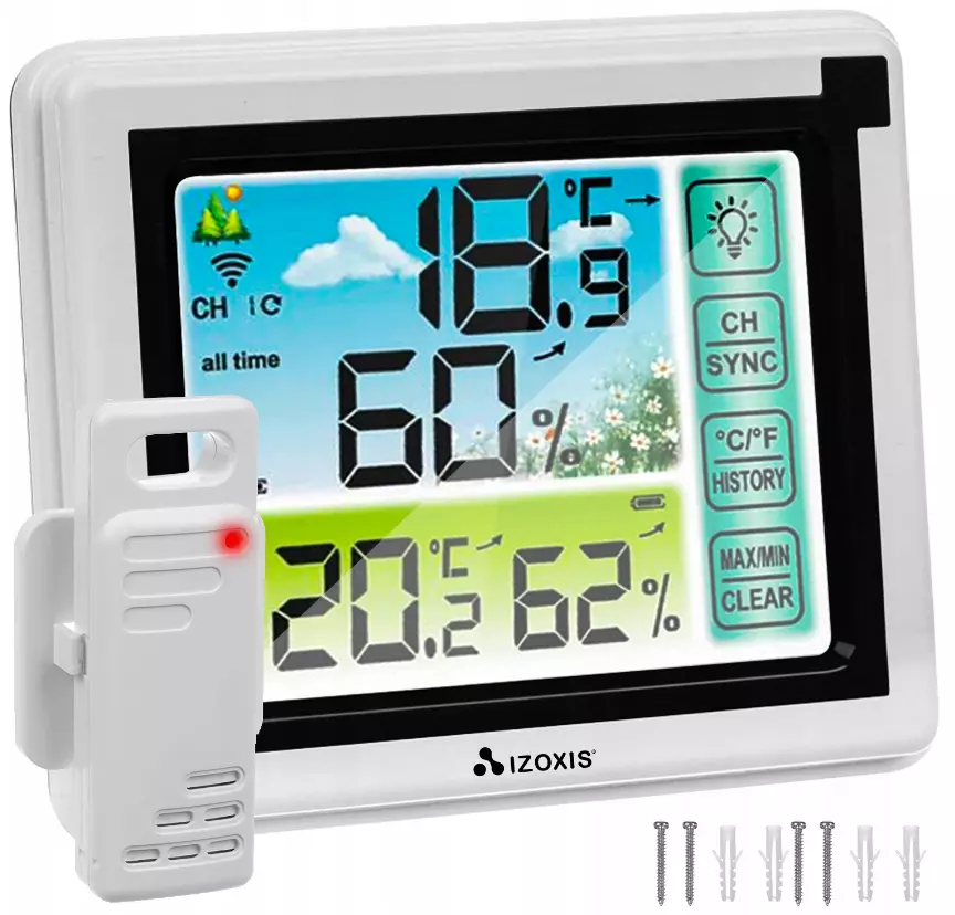 Беспроводная метеостанция - это современный аксессуар, оснащенный четким дисплеем, с которого каждый может легко прочитать значения, измеренные в данный момент. Устройство оснащено 4 кнопками: подсветка экрана, ch/sync - выбор канала или синхронизация чтения, °C.°F/history - переключение единиц измерения, история записей, max. min./clear - минимальная и максимальная записи и возможность очистки памяти.