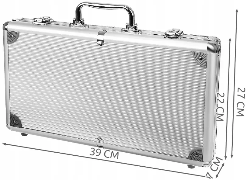 Набор для покера упакован в очень прочный алюминиевый кейс, оснащенный двумя застежками-клипсами, поэтому нет необходимости каждый раз закрывать его на замок.