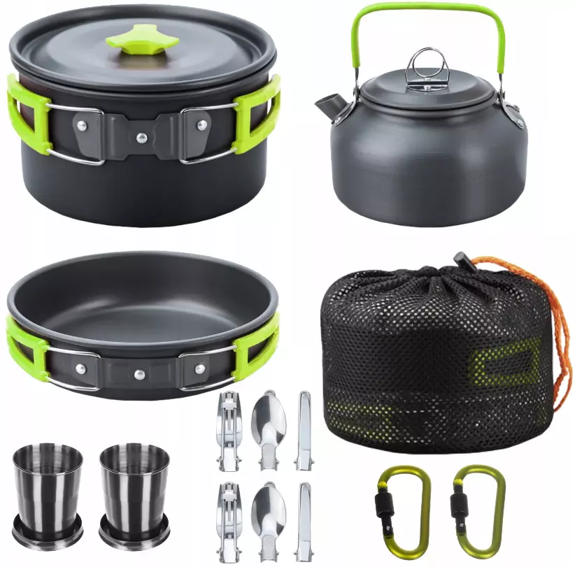 В комплект туристической посуды входит 18 элементов, включая кастрюлю, чайник, сковороду, 2 складных ножа, вилку и ложку, 2 карабина, 2 складных кружки, мешочек для хранения.