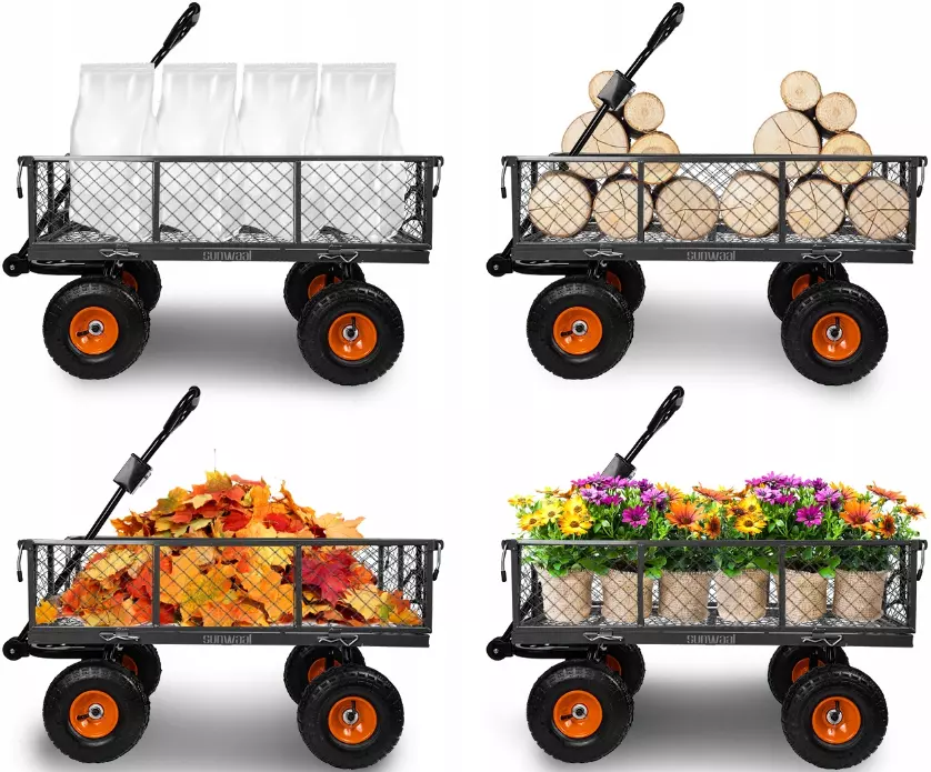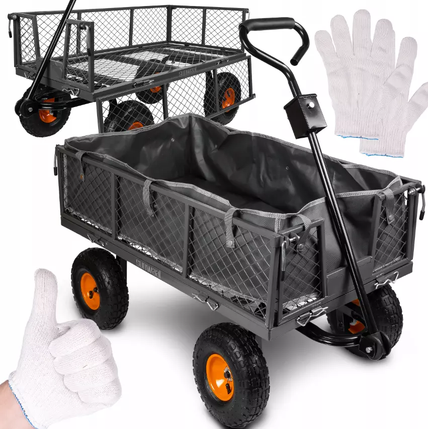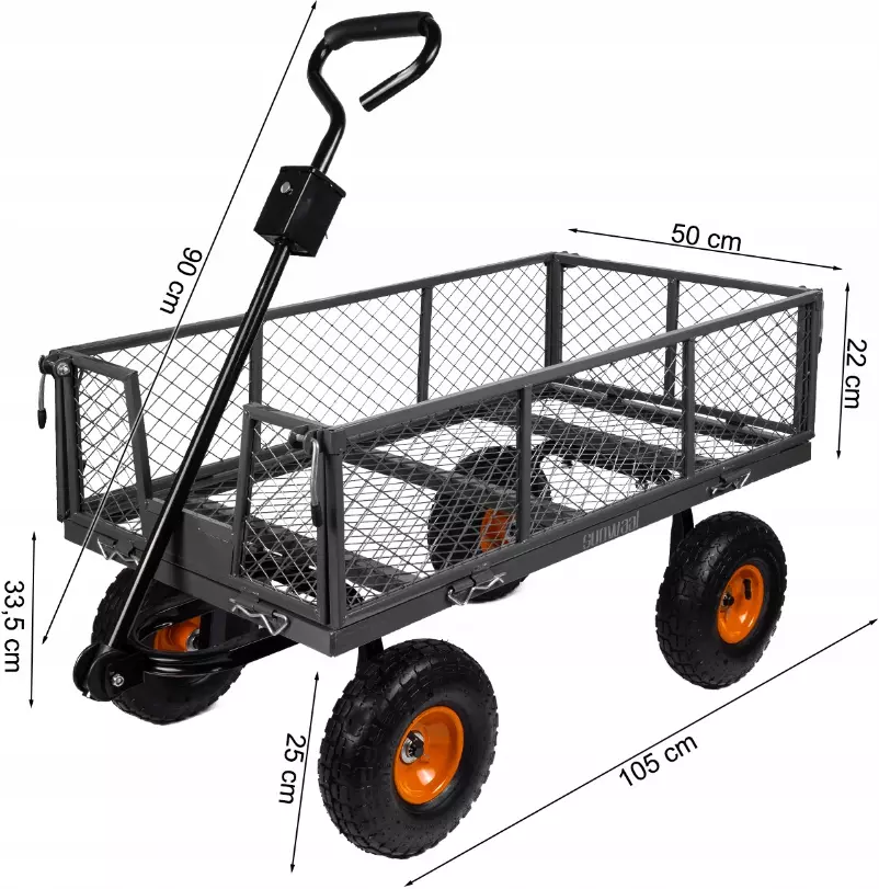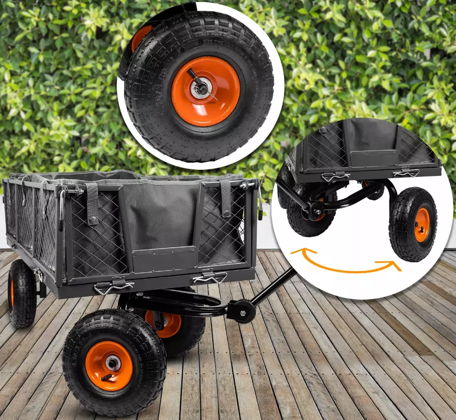 Садовый прицеп имеет ручку, которая позволяет прикрепить его, например, к трактору, квадроциклу, газонокосилке и т. д. Это, несомненно, идеальное решение для сада, участка или фермы.
