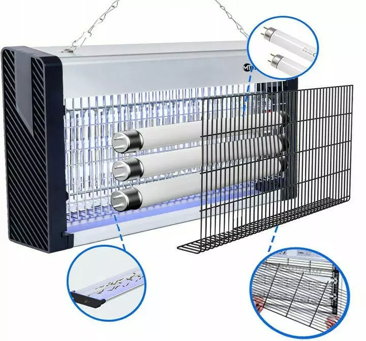 Лампа идеальна для использования, например, на кухне, в караване, сарае, коровнике, производственном цехе, магазине, на террасе и везде, где присутствие летающих насекомых нежелательно. УФ-свет эффективно привлекает насекомых, а встреча с высоковольтной сеткой эффективно их устраняет.