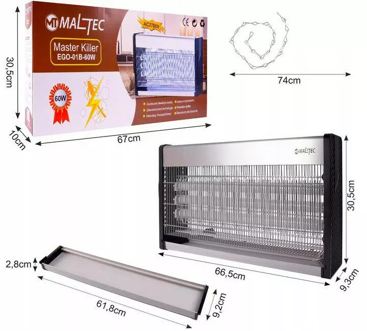 Инсектицидные лампы Maltec безопасны для здоровья наших близких и нашего. Ультрафиолетовое излучение, излучаемое лампой, совершенно безвредно для человека и домашних животных. Поскольку люминесцентная лампа защищена сеткой, ее можно без опасений использовать даже в присутствии детей. Электронный трансформатор и магнитный балласт обеспечивают безаварийную работу светильника.