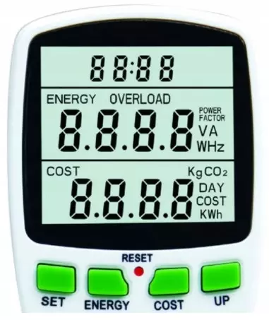 Ваттметр в режиме измерения позволяет проверять множество различных параметров, включая не только мощность и затраты, но и общее время измерения, напряжение, частоту, коэффициент мощности и т. д. Дополнительная кнопка позволяет выполнить сброс прибора и восстановить исходные параметры. .