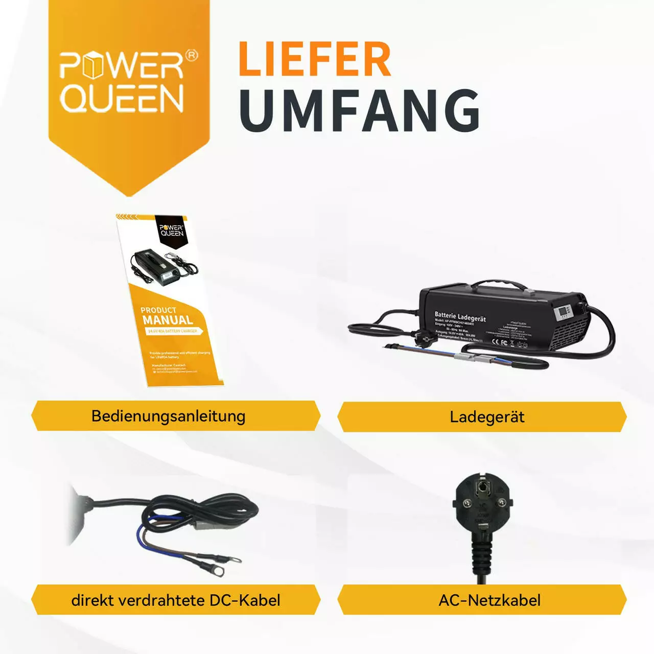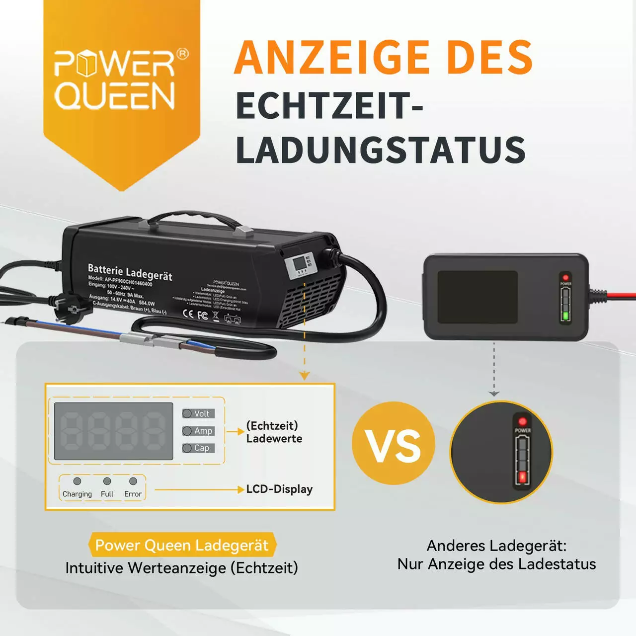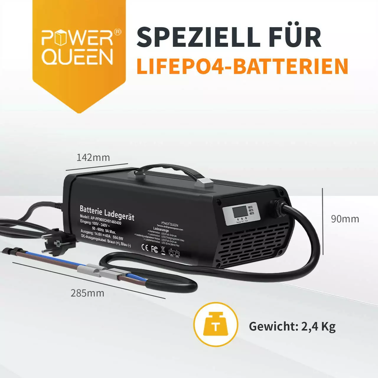 Зарядное устройство для аккумулятора POWER QUEEN 14,6 В, 40А LiFePO4 рассчитано на большой выходной ток 40А и использует двухступенчатый постоянный ток/постоянное напряжение (CC/CV), что может значительно продлить срок службы аккумулятора. Наше зарядное устройство может автоматически полностью зарядить литиевую батарею емкостью 200 Ач примерно за 5 часов. Это оптимальное решение для аккумуляторов большей емкости и аккумуляторов глубокого цикла.